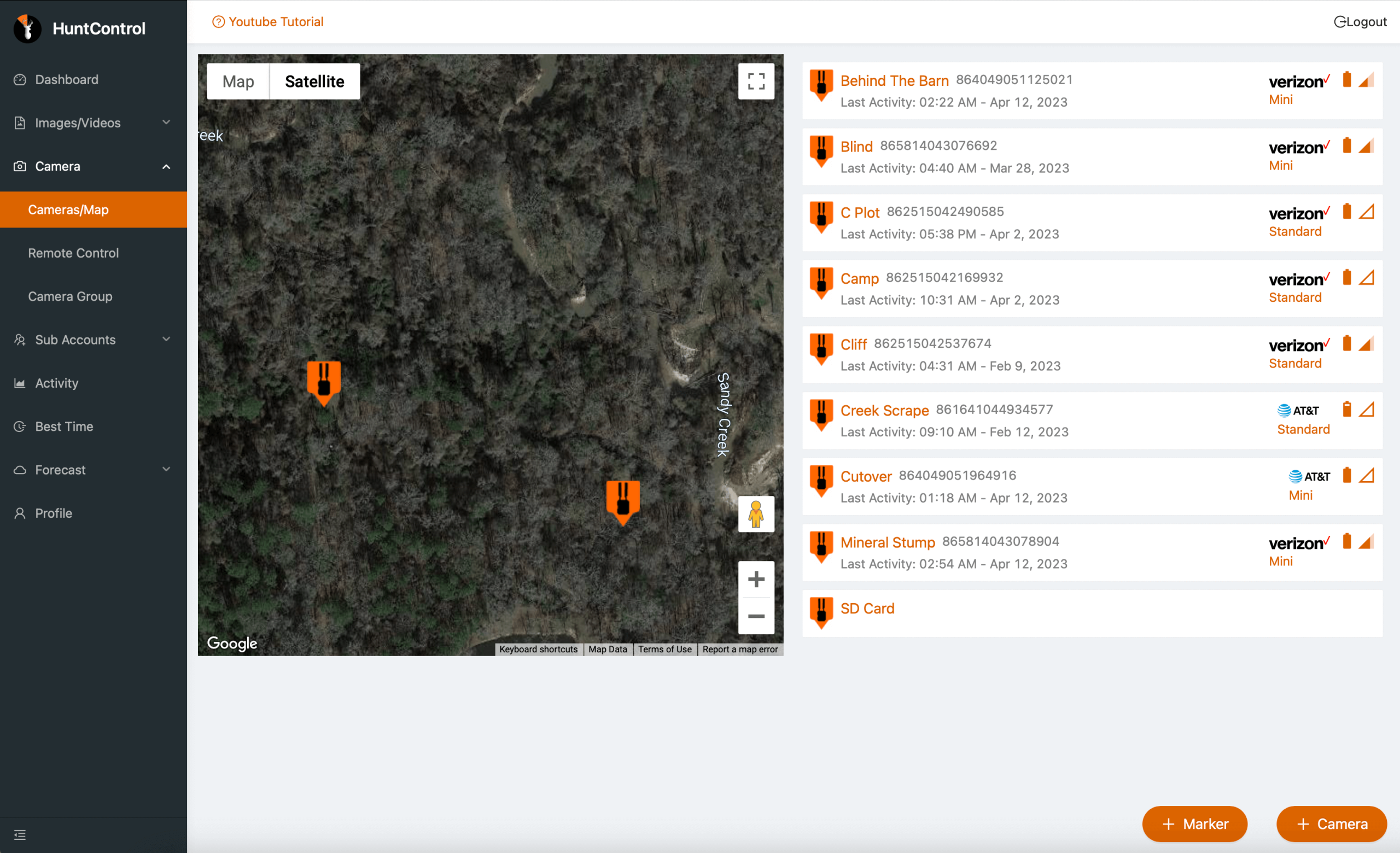 Add a DataCam or any brand of trail camera to HuntControl (manual image upload for other brands). Use the DataCam's built-in GPS coordinates or search on an interactive satellite map to get the exact location of the trail camera.